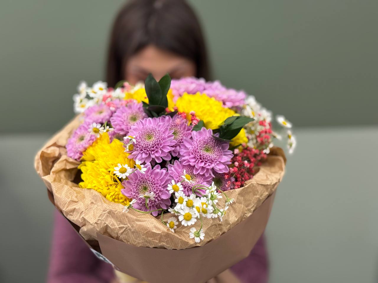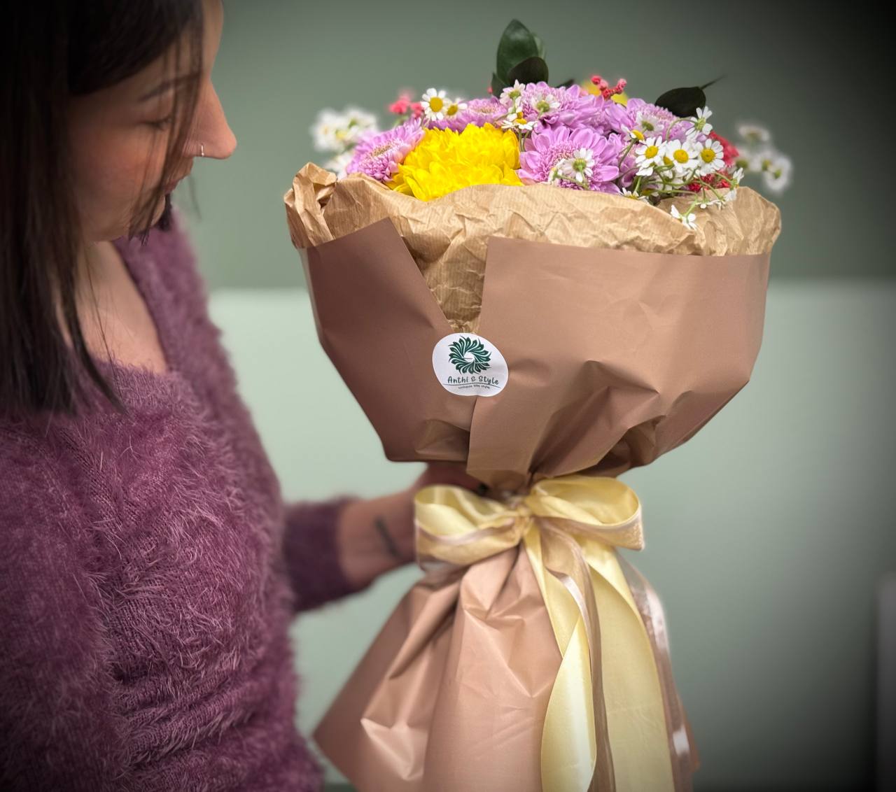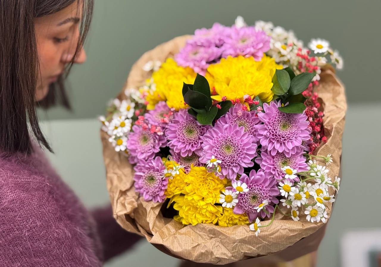 Μπουκέτο από χρυσάνθεμα, περιέχει επίσης εποχιακά λουλούδια και πρασινάδα.