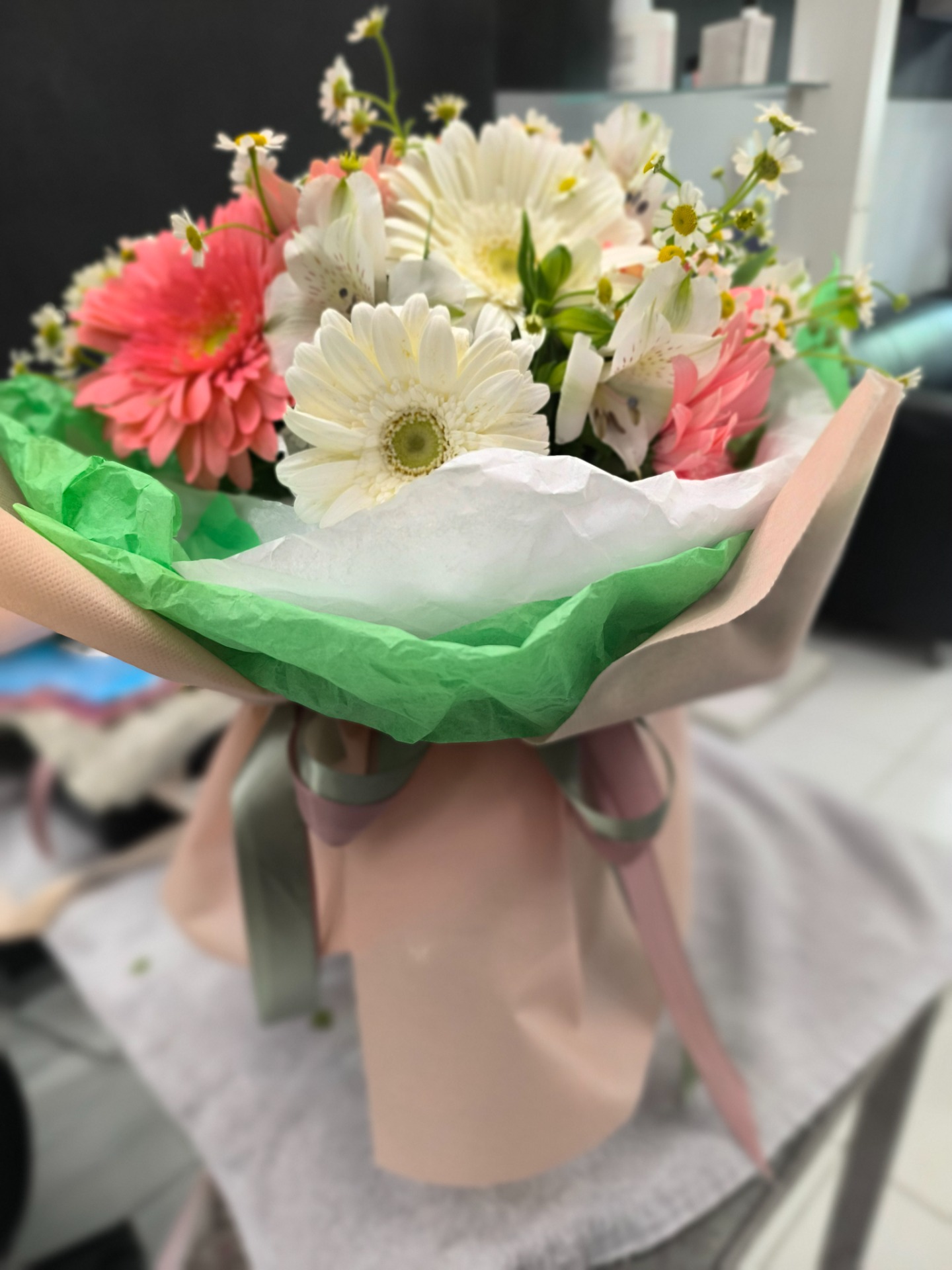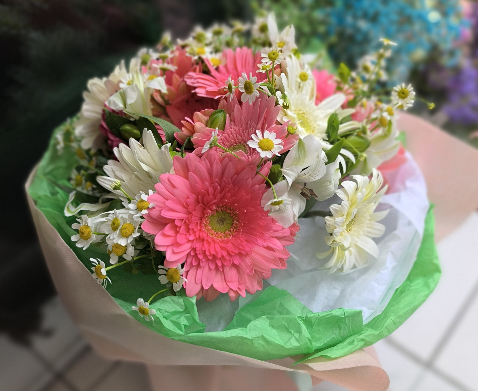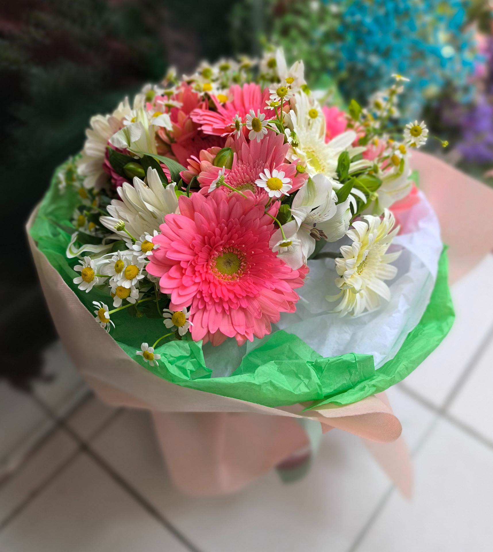Φωτεινό μπουκέτο με πολύχρωμες ζέρμπερες, περιέχει επίσης εποχιακά λουλούδια και πρασινάδα.