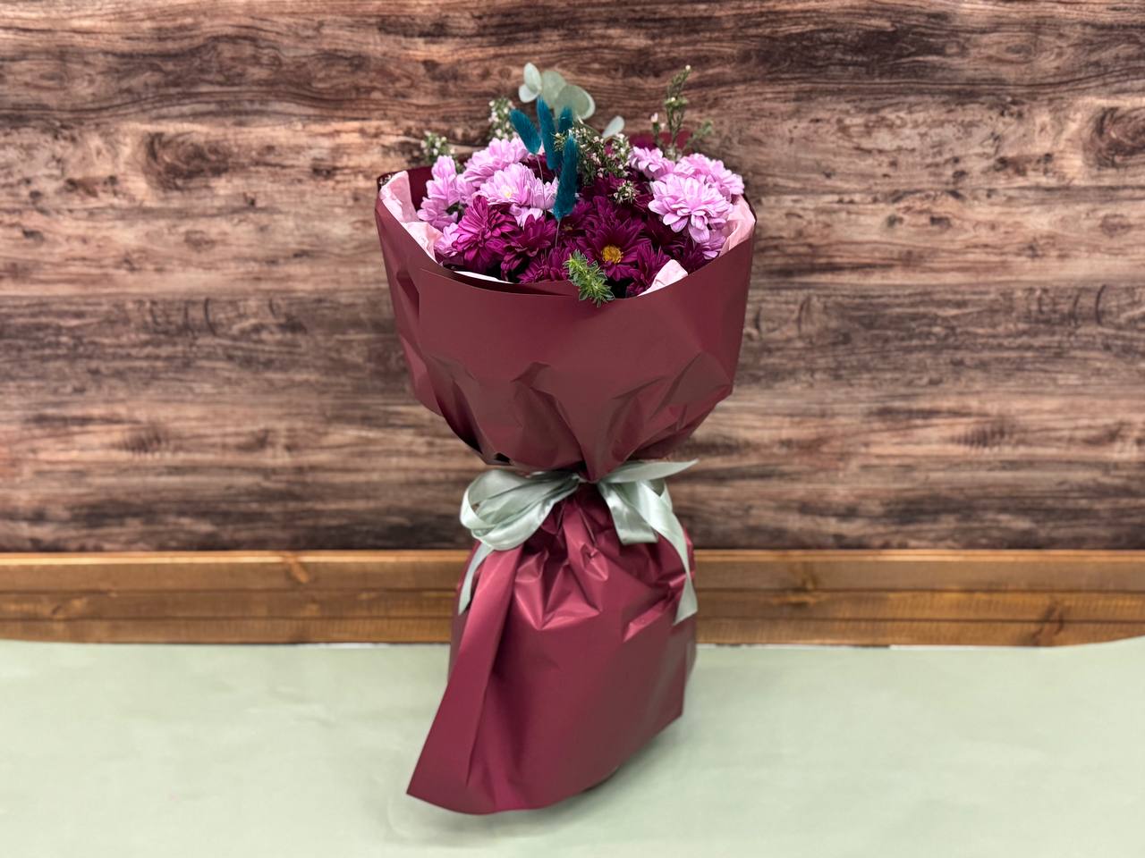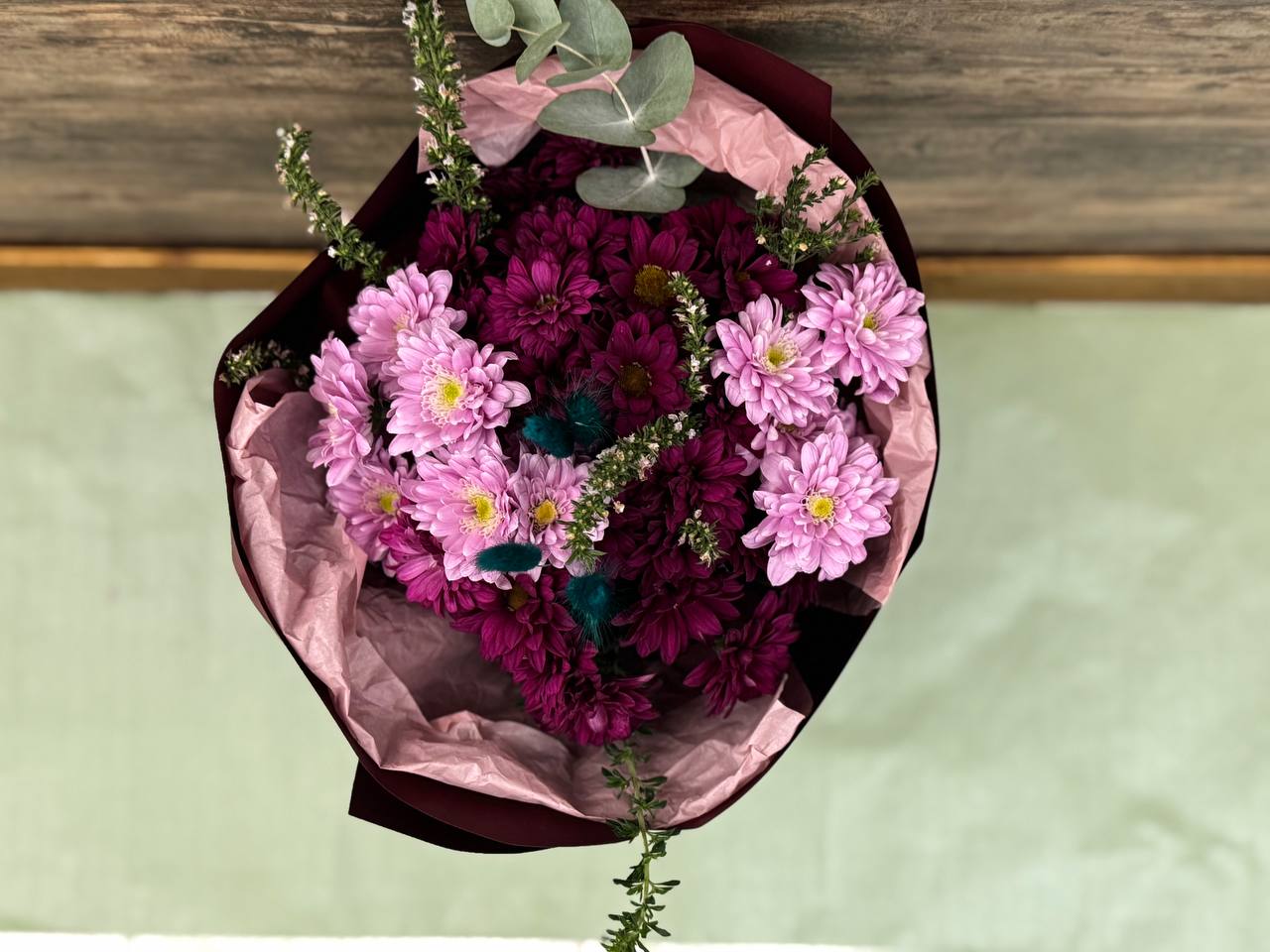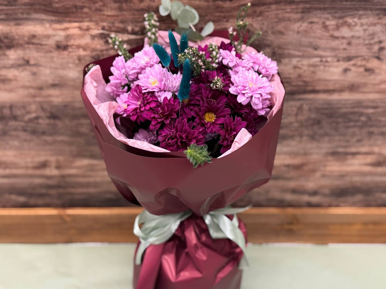 Μπουκέτο από χρυσάνθεμα. Σε σκουρες αποχρωσεις, περιέχει επίσης εποχιακά λουλούδια και πρασινάδα.