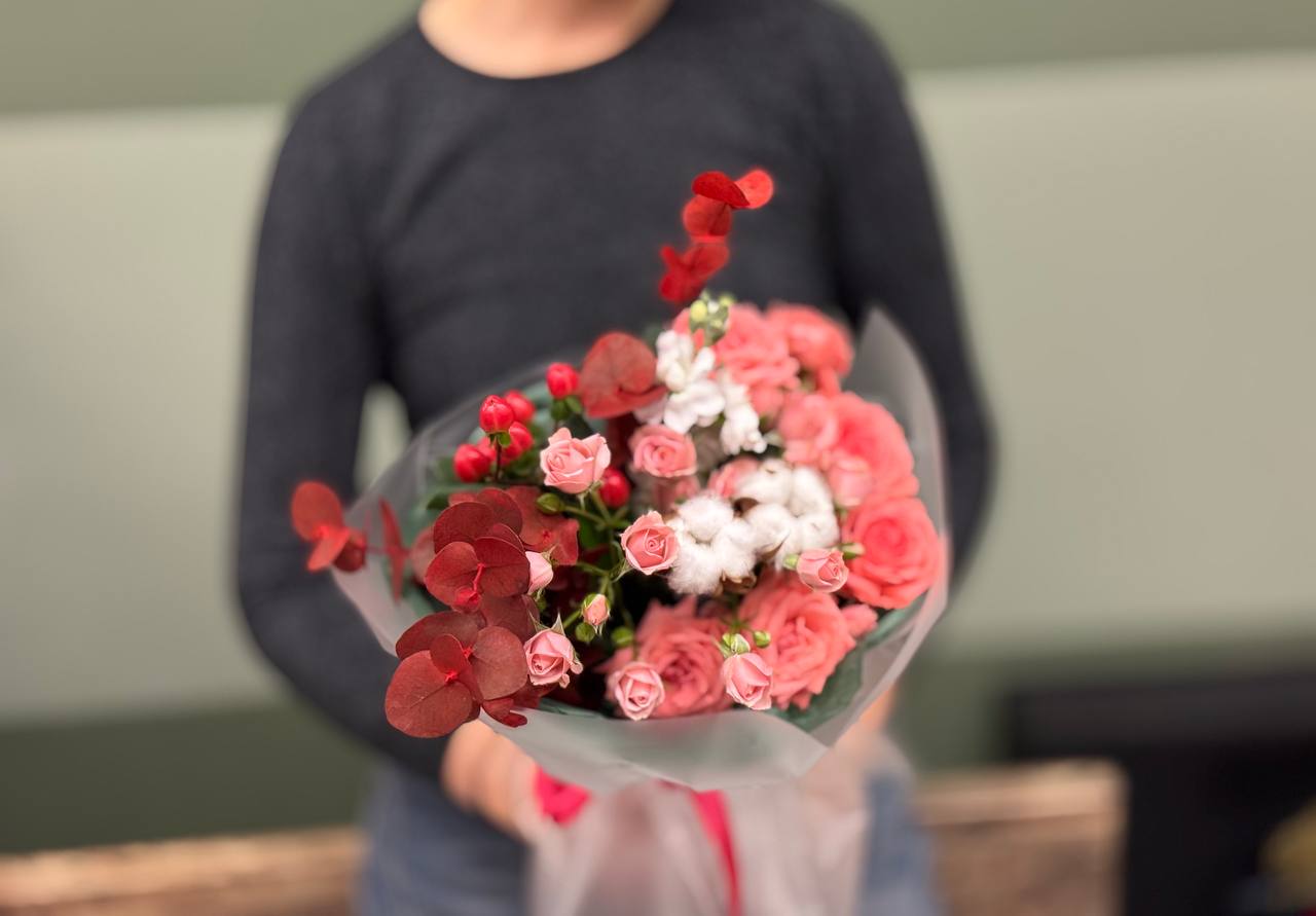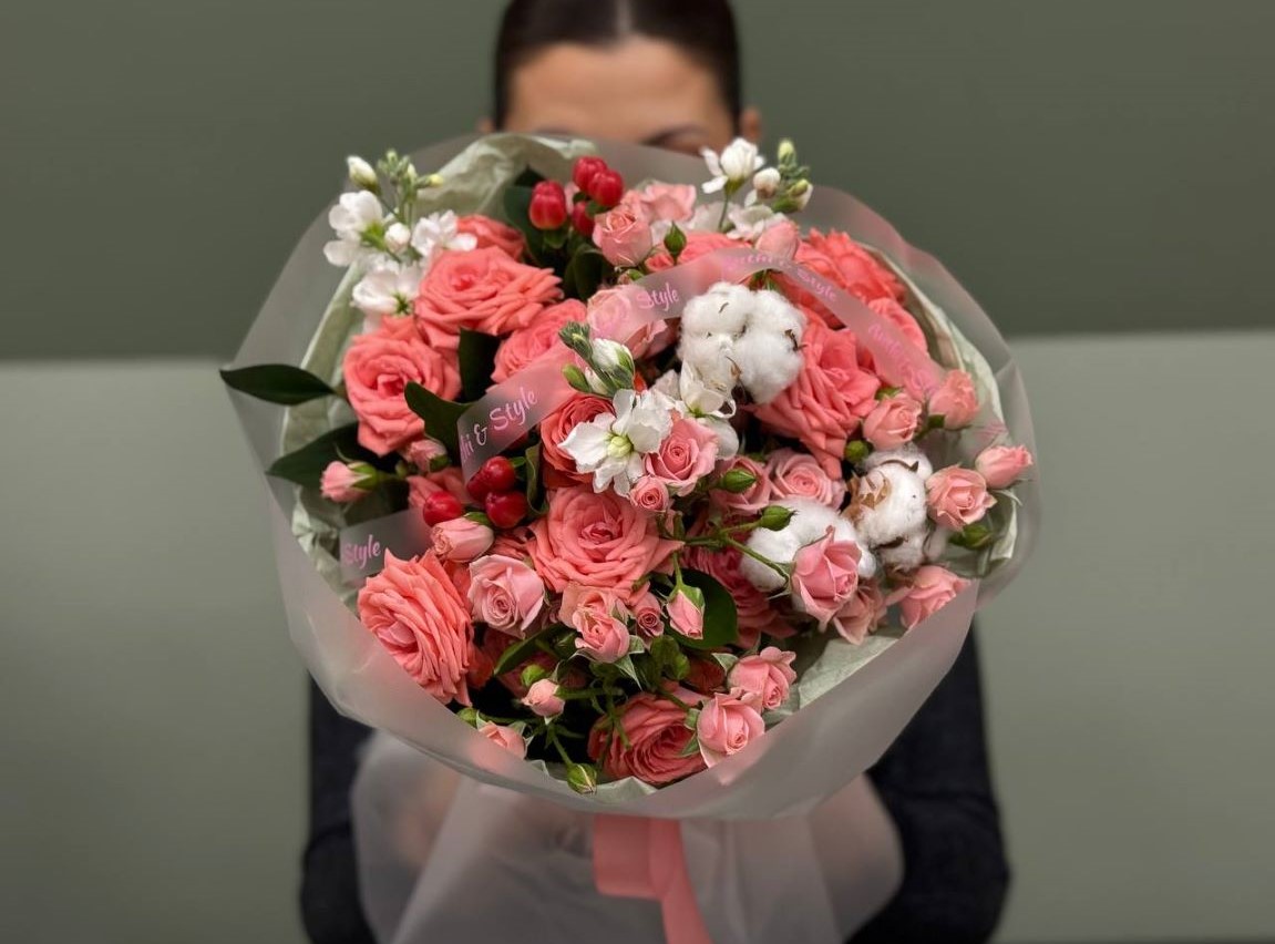 Ρομαντική ανθοδέσμη με τριαντάφυλλα spray και εκλεκτά εποχιακά λουλούδια σε κομψές παστέλ αποχρώσεις.