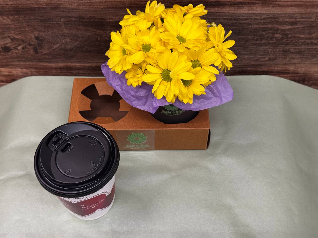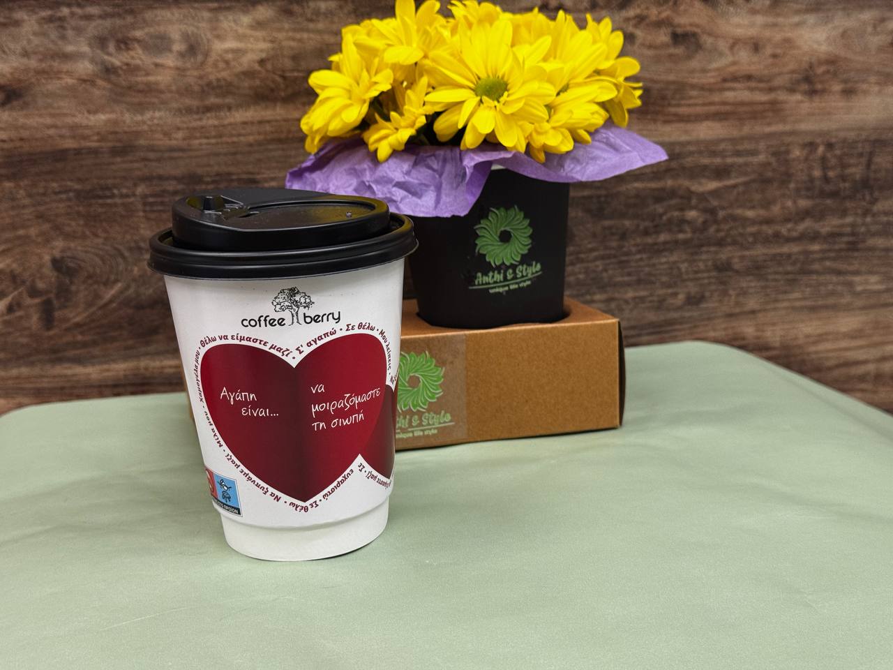 Ο αγαπημένος σας καφές* ( Coffee Berry Αχαρνών 209) μαζί με ένα μίνι μπουκέτο σε ποτηράκι.